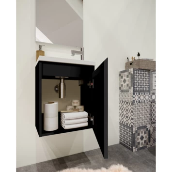 Maak het jezelf makkelijk met de Portopack van Allibert. Het kastje onder de wastafel krijg je voorgemonteerd geleverd; je hoeft het wandmeubel alleen nog aan de muur te hangen met schroeven. Het heeft de afmetingen van 40 cm breed 45 cm hoog en 25 cm diep. De kast heeft een naar rechtsdraaiend deurtje (scharnieren aan de rechterzijde) en met het soft-close systeem sluit je deze altijd zachtjes. De diepe zwarte kleur heeft een glanzende afwerking. Doordat de deur geen grepen heeft, oogt deze mooi strak en past perfect in jouw moderne badkamer.