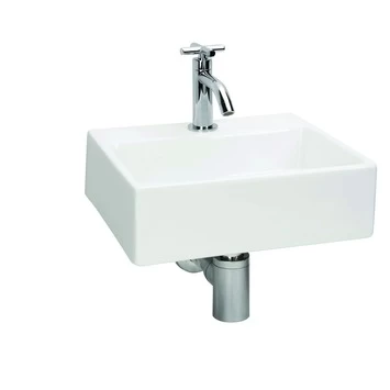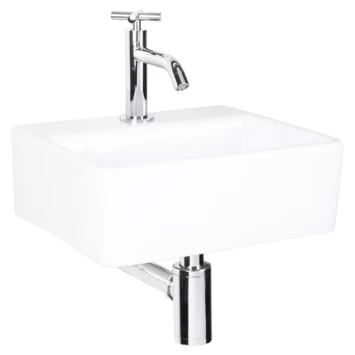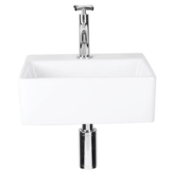 De witte keramische Differnz Dif-fonteinset Argus is een moderne wastafelset, geschikt voor vrijwel iedere sanitaire ruimte, zoals badkamer of toilet. Dankzij de chique, eigentijdse uitstraling en witte kleur past de fonteinset bij uiteenlopende interieurstijlen. De fonteinset is gemaakt van wit keramiek. Je krijgt de set geleverd inclusief koudwaterkraan, afvoer en sifon. Je monteert de fonteinset van wit keramiek met kraan en sifon eenvoudig zelf en bevestigt de set door middel van de bevestigingspunten aan de muur. Deze bevestigingspunten bevinden zich uit het zicht van de gebruiker, zodat de witte fonteinset van Differnz Dif Argus mooi afgewerkt in jouw badkamer of toilet hangt. De wastafel is slechts op één manier te plaatsen: recht tegen de muur aan met het kraangat en de kraan naar voren gericht. Wil je liever een fonteinset in de hoek van jouw sanitaire ruimte? Bekijk dan het assortiment wastafelsets.