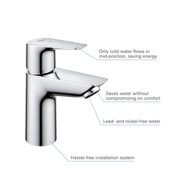 De GROHE Start Edge wastafelkraan met standaard maat geeft elke badkamer een fris en nieuw gevoel. Het zit boordevol handige, moderne functies aangevuld met details zoals de hendel die in een hoek van zeven graden staat en zo zorgt voor extra gebruikscomfort. De kraan is heel duurzaam dankzij GROHE EcoJoy die het waterverbruik reduceert tot 5,7 l/min, terwijl het toch een krachtige waterstraal geeft. Het GROHE LongLife ES-cartouche biedt duurzame, betrouwbare volume- en temperatuurregeling en voorkomt ook verspilling van energie door koud water te geven als middelste stand van de hendel. Een temperatuurbegrenzer bespaart energie. De mengkraan heeft een gladde body en een handige push-open pop-up waste die je bedient met een lichte aanraking van je vinger. GROHE Zero geïsoleerde binnenwateren zorgen ervoor dat het water in de kraan lood- en nikkelvrij is. Dankzij het Easy Installation System met flexibele aansluitslangen kan het snel en gemakkelijk worden gemonteerd. Deze badkamerkraan is afgewerkt in de duurzame GROHE StarLight chrome afwerking en blijft er jarenlang perfect uitzien.