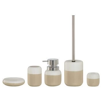 De complete Sphere serie in twee contrasterende kleuren, zand en wit, kleedt je badkamer in één keer aan.