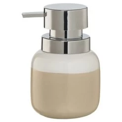 De complete Sphere serie in twee contrasterende kleuren, zand en wit, kleedt je badkamer in één keer aan.