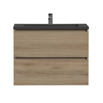 Het greeploze Tiger Karlo badkamermeubel is speciaal ontworpen voor de strakke en moderne badkamer. De wastafelonderkast heeft 2 ruime lades om alle badkamerspullen overzichtelijk in op te bergen. De lades zijn uitgerust met hoogwaardige ‘soft close’ geleiders waardoor ze geruisloos sluiten. De warme houttint geeft een sfeervol karakter aan het meubel. Daarnaast krijgt het meubel, door de voelbare houtnerf, een mooie natuurlijke uitstraling. De strakke, mat zwarte polybeton wastafel met immitatie natuursteen look maakt deze set compleet.