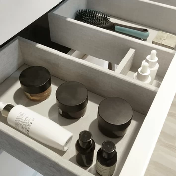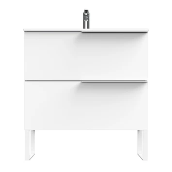 Haal het maximale uit je badkamer met deze wastafelonderkast in Scandinavische stijl. Het strakke design is simpel maar elegant. Deze slimme kast heeft een diepte van slechts 39 cm. Ideaal voor de kleinere badkamer. Dankzij haar effen lijnen laat hij de ruimte groter ogen. De ruime lades zijn uitgerust met Hettich softclosegeleiders en de binnenzijde heeft een trendy afwerking in textiel. De matwitte grepen zijn perfect in het geheel verwerkt, net als de twee speelse sierpoten. De luxueuse afwerking in hoogglans wit zorgt voor een frisse en ruimtelijke look.