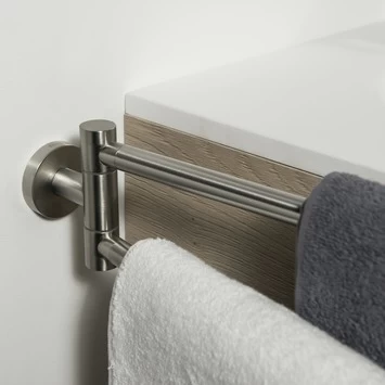 Het Tiger Dubbel Handdoekrek Boston met Draaibare Armen RVS van de accessoire serie Boston is uitgevoerd in geborsteld RVS, en is ook verkrijgbaar in glanzend RVS. Dit product kan uitsluitend worden bevestigd met de meegeleverde schroeven. Er zijn van deze serie diverse sanitair accessoires verkrijgbaar. Dit product maakt deel uit van het Boston totaalconcept, dat verder bestaat uit kranen, badmeubelen, douche accessoires en douchecabines, alles in de Boston stijl.
